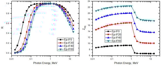 In general, the maximum Zeff value in the composites was 10.03 (at the lowest energy), while the minimum value was 4.00 (at the highest energy). In all fabricated composites, the Zeff values have the highest values at low energy and gradually decrease to 0.15 MeV and become constant from 0.2 to 2 MeV; at higher energy levels, the behavior of the Zeff curve gradually increases with increasing photon energy. The equivalent atomic number (Zeq) and the R-ratio were calculated within a broad energy range (0.015–15 MeV), as shown in Figure 13. These parameters were calculated according to Section 2 equations to estimate the EBF of the epoxy–iron filing composites. The R value results are , so it starts from 0.06 to 0.998 up to 0.15 MeV, then it stabilizes with a value of 0.999 to , then it gradually decreases to 0.6 at 15 MeV, and the R values have the same behavior for epoxy–iron filing composites. The behavior of Zeq displays nearly stable values from 8.5 to 9.5 from 0.015 to 1 MeV; at higher energy levels, the Zeq values decrease at 1.5 MeV and then stabilize at the values of 6.66, 7.08, 7.54, and 8.00 for EP–IF0, EP–IF20, EP–IF40, and EP–IF60, respectively.