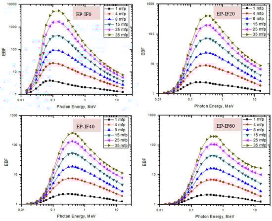 Experimental results of the composites in Table 1 are shown in Figure 14. Figure 15 shows the EBF at 1,4, 8, 15, 25, and 35 mfp. The figure displays the same behavior of EBF for all epoxy/iron filing composites with different mean free paths, where the EBF increased from 1 with increasing energy to a maximum value at 0.1 MeV, and gradually decreased with increasing energy; in addition, the maximum value increases when raising the mfp value. For EP–1F60 composites, the EBF at the discussed lowest energy (0.015 MeV) was 1.121, 1.243, 1.316, 1.402, 1.481, and 1.521 at 1, 4, 8, 15, 25, and 35 mfp, respectively. At 0.1 MeV, the EBF at 1 mfp was 4.051, 4.036, 4.021, and 4.008 for EP–IF0, EP–IF20, EP–IF40 and EP–IF60, respectively.