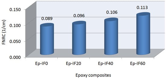 In order to investigate the neutron radiation shielding property of iron filing-doped epoxy composites, the macroscopic cross-section (FNRC) for fast neutrons was calculated. The high number of interactions per unit of time means high values of FNRC and, in this case, the attenuation of fast neutrons occurs at higher rates. The calculated FNRC values for the produced EP–IF composites are given in Figure 15; it is clear from Figure 15 that the FNRC values increased as the iron filing ratio in epoxy increased. The highest value for FNRC was found at 0.113 cm−1 for the EP–IF60 (60% IF added) composite; when these values are compared with some studies in the literature, it is clear that they are higher than 0.093 cm−1 for ordinary concrete [40].