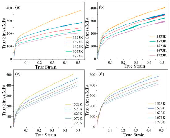 Figure 1 presents the true stress–true strain curves for Nb521 under various strain rates. There is a monotonic increase in stress corresponding to the strain, signifying an initial occurrence of strain hardening, which can be attributed to an increase in dislocation density []. No yield plateau is produced. At the same strain rate, the stress decreases with the temperature increase. This is because as the temperature increases, the atomic thermal motion of the metal becomes intense, and dislocation is more likely to cancel out, resulting in thermal softening instead of hardening. As shown in Figure 1, the flow stress increases with the increase in strain rate at the same temperature due to the work hardening caused by the increase in dislocation. For example, at 1523 K, the true stress is 282 MPa when the strain rate is 0.01 and the strain of 0.2. It increases to 415 MPa when the strain rate is 10. During the plastic phase, as the strain increases, the flow stress monotonically increases until fracture, indicating that the hardening effect is always greater than the softening effect during the deformation process.