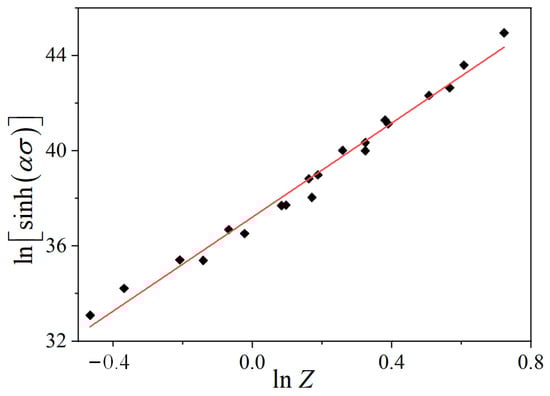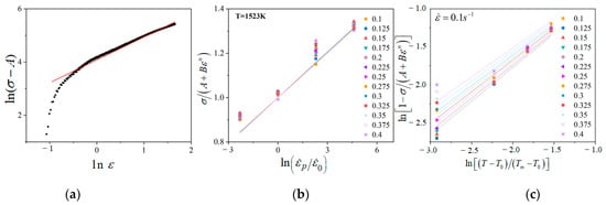 Under this deformation condition, as shown in Figure 2a, A is the material’s yield stress of 176.99 MPa. We can obtain the relationship between and at the reference temperature and strain rate by substituting A into the equation. n can be confirmed by the slope of the linear fitting, which equals 0.8577, and lnB is the intercept of 6.51, this means that B is 59.45 MPa.