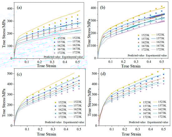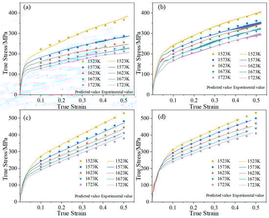 The Arrhenius model’s predicted and experimental value comparison is illustrated in Figure 9. As can be seen from Figure 9, when the strain rate is 0.01 , the predicted value is smaller than the actual value at 1523 K but larger than the actual value at other temperatures. When the strain rate is 0.1 , the predicted value is small when the temperature exceeds 1623 K, and the prediction effect is better at other temperatures. When the strain rate is 1 , the predicted value is more accurate at low strain, but with the increase in strain, the stress increment is smaller than the actual value. When the strain rate is 10 , the increment of the predicted value with the temperature gradient is larger than the actual value. Overall, when the strain rate is high and the strain is minimal, the predicted value is more accurate, and the accuracy decreases with strain increment []. The deviations could be due to the intrinsic limitations of the constitutive equation.