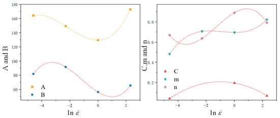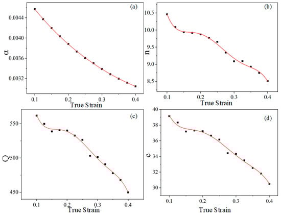 Under different temperatures and strain rates, strain affects both the flow stress and the material constant []. The material constants are polynomial functions within the strain range. The equations are as follows: