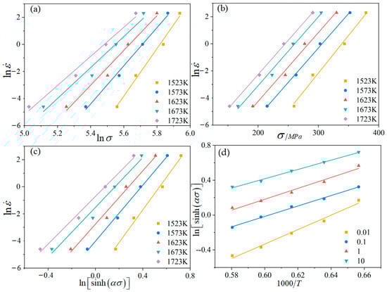 where refers to the strain rate (), Q is the activation energy of hot deformation () and R is the universal gas constant (8.314 ). Q reflects the microstructure mechanism in the hot-deformation process, and c is the frequency index. are material constants in which . It must be noted that the power form and exponential form work for low-stress levels () and high-stress levels (). The hyperbolic sine function in the third equation is more general, covering a wider stress range. Therefore, this research used the hyperbolic sine function to describe the thermal-deformation behaviour of the Nb521 alloy.