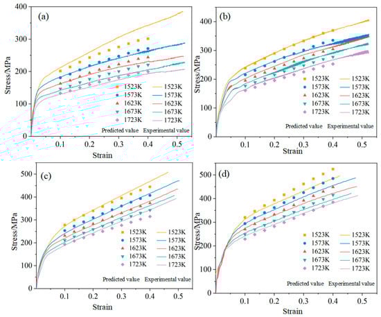 Comparison between predicted and experimental flow stress using the strain-compensated Arrhenius model at different strain rates: (a) 0.01 ; (b) 0.1 ; (c) 1 ; (d) 10 .