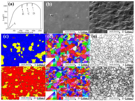 In situ EBSD tensile tests give (a) load–displacement curve; and figures by Channel 5 show (b) morphology of the sample surface; (c) recrystallized fraction; (d) inverse pole figure; (e) low- and high-angle grain boundary at the displacement of 0 and 1900.