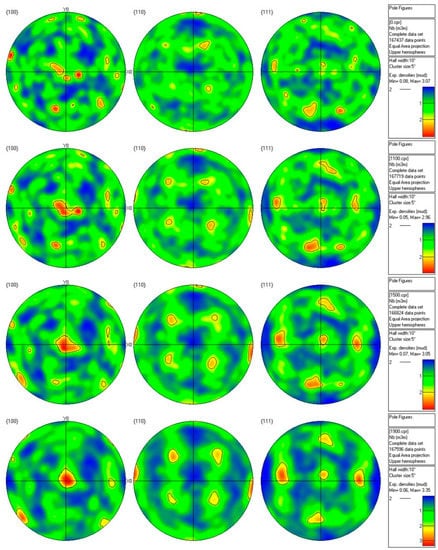 Figure 11 displays the pole figure of {100},{110},{111} for Nb521 when the displacement is 0, 1100, 1500 and 1900 μm, where X0 is TD and Y0 is RD. Wu et al. [] outlined that grains tend to be arranged rather than dispersed with increased stress, and larger tensile stress will enhance the cubic texture. It can be observed that there is no specific texture in the material at the beginning, but with the progress of stretching, a particular texture is gradually formed. Since Nb is a body-centred cubic crystal, it can be seen that the material has a {001} <110> cubic texture []. This observation indicates that stretching causes the Nb521 grains to tend to arrange to form a specific texture, thus possibly enhancing work hardening.