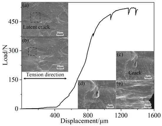 The in situ tensile curve at room temperature and micromorphology in the surface at the displacement of (a) 864.38 μm, (b) 1377.54 μm, (c) necking, (d) 1404 μm and (e) fracture.