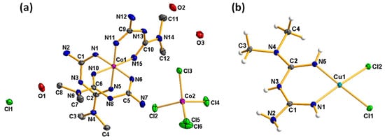 ORTEP-type diagram at the 50% probability level of the asymmetric unit of the (a) Met-Co-2 and (b) Met-Cu-2 compounds. Hydrogen atoms in Met-Co-2 were removed for clarity.