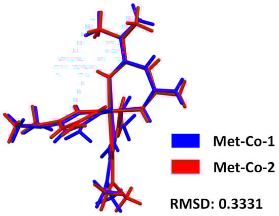 RMSD comparative analysis of the cationic [Co(Met)3]2+ (Met-Co-1 = blue, reference [6]) and [Co(Met)3]3+ subunits (Met-Co-2 = red, this study).
