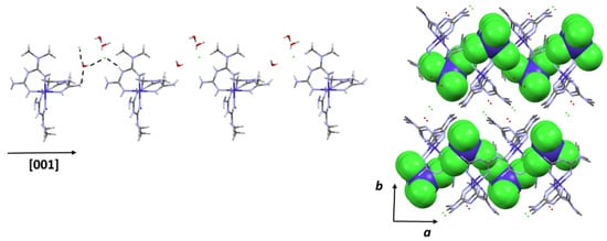 From the supramolecular view, the Met-Co-2 complex is formed by two subunits: [Co(Met)3]3+ and [CoCl4]2−. The cationic units are joined along the [001] direction by N-H∙∙∙O, O-H∙∙∙Cl and N-H∙∙∙Cl interactions with distances of 2.964, 3.139 and 3.240 Å, respectively (Figure 4). The chains of the cationic subunit are linked by the anionic subunits along the [100] direction through O-H∙∙∙Cl and N-H∙∙∙Cl weak interactions, with distances of 3.257 and 3.270 Å, respectively. Finally, the crystal packing is formed by O-H∙∙∙Cl and N-H∙∙∙O intermolecular interactions between the cationic subunits, the chloride anion and the water molecules, giving rise to the formation of chains along the [010] direction (Figure 4).