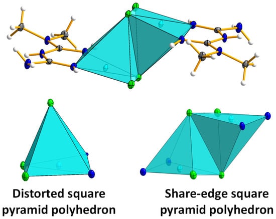 The compound Met-Cu-2 is represented by the formula [Cu(C4H11N5)Cl)2-μ-Cl2] and it was obtained as blue crystals that crystallized in the P21/n monoclinic space group. The asymmetric unit is formed by a Cu(II) metallic cation coordinated to one chelate metformin ligand and two chloride atoms (Figure 5). This complex presents a dimeric structure composed of two copper atoms joined through two bridge chloride ligands (μ-Cl), two terminal chlorides and one metformin molecule coordinated through the nitrogen atoms to each metal center in a distorted square pyramid arrangement (τ = 0.18) (Figure 5) [24].