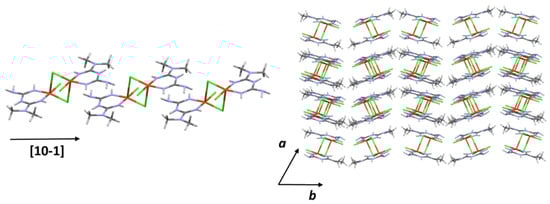 Chains of the dimeric units along the [10−1] direction and crystal packing of the Met-Cu-2 compound.
