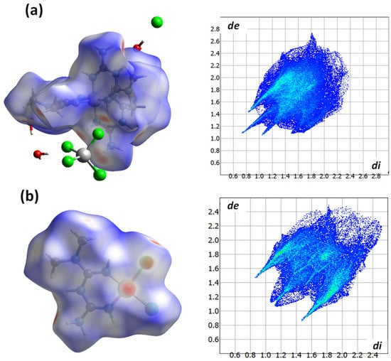 To better understand the supramolecular interactions present in the complexes Met-Co-2 and Met-Cu-2, the Hirshfeld surface (HS) and fingerprint plots (FPP) analyses were performed [25,26,27]. These tools are used to generate a dnorm surface or normalized contact distance based on the contact distances between the donor and acceptor atoms [25]. The color code corresponds to the sum of the van der Waals radii distances (red < sum VdWradii; blue = sum VdW radii; white > sum VdW radii) (Figure 7).