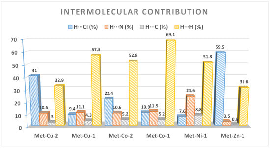 Intermolecular contact values for Met-Cu-1 *, Met-Cu-2 **, Met-Co-1 *, Met-Co-2 **, Met-Ni-1 * and Met-Zn-1 * complexes. (* Reference [6]; ** this study).