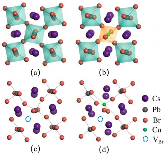 Geometric structures of (a) CsPbBr3 supercell, (b) CsPb0.875Cu0.125Br3 supercell, (c) VBr-containing CsPbBr3 supercell, and (d) CuPbVBr complex containing CsPb0.875Cu0.125Br3 supercell, respectively.