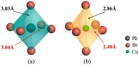 Localized structures of (a) [PbX6] in the pristine CsPbBr3 and (b) [CuX6] in CsPb0.875Cu0.125Br3 supercells, respectively.