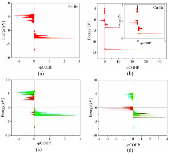 COHP analyses for (a) Pb–Br bond in pristine CsPbBr3 and (b) Cu–Br bond in CsPb0.875Cu0.125Br3, respectively. Orbital COHP analyses for (c) Pb [6p]-Br [4s] (red) and Pb [6p]-Br [4p] (green) in pristine CsPbBr3 and (d) Cu [3d]-Br [4p] (red) and Pb [6p]-Br [4p] (green) in CsPb0.875Cu0.125Br3 supercell, respectively. The inset in (b) represents the enlarged COHP analyses with the energy from −5 eV to 5 eV for Cu–Br bond in CsPb0.875Cu0.125Br3.