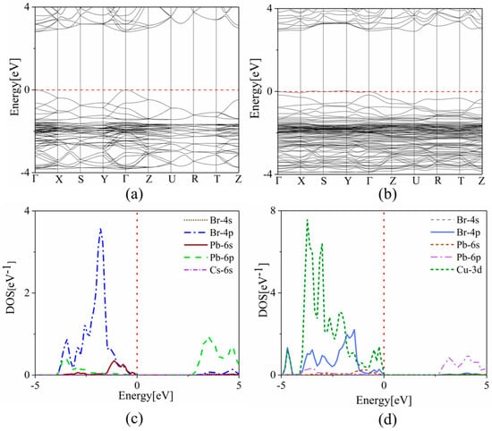 The band structures of (a) CsPbBr3 and (b) CsPb0.875Cu0.125Br3 systems, respectively. The partial density of states of (c) CsPbBr3 and (d) CsPb0.875Cu0.125Br3 systems, respectively. The red dash line represents the Fermi level and the black line represents the relationship between the energy of the electron and its momentum.