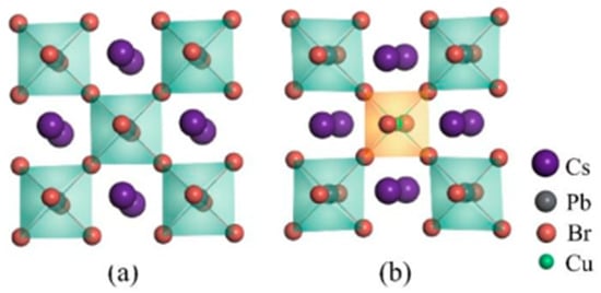 To gain a better understanding of the effect induced by Cu dopant on CsPbBr3 perovskites, we focus on studying the geometric changes caused by the dopant. According to the commonly held view, the stability of a perovskite can be evaluated based on the tolerance factor t, which is defined in Equation (2).