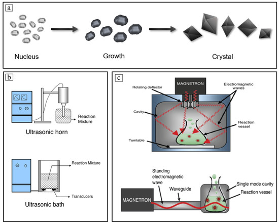 (a) Common nucleation growth pathway of a crystal; (b) standard designs of the ultrasound reactors; (c) representations of different designs for microwave reactors.