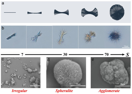 In addition to the aforementioned customary investigations on nucleation and growth that concentrated on increasing production efficiency, Yan hypothesized a unique mechanism of noncrystallographic branching during reactive crystallization of calcium citrate, as shown in Figure 2a. The morphological evolution of calcium citrate spherulite can be synoptically divided into three phases according to images of optical microscopy displayed in Figure 2b. In the first phase, the early precursor materials gather to form rod-like crystals that grow from the center to the ends. The beginning of the second phase consists of the front of both sides of the crystal gradually developing small angular branching without clear direction due to the various growth angles. The third phase involves the formation of spherical crystals through the complete filling of the crystal from the center outward in all directions. Additionally, the image shown in Figure 2c indicates that supersaturation and spherulite development are tightly connected [35].