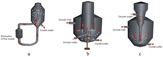 (a) Forced-circulation crystallizer; (b) Draft-tube baffled crystallizer; (c) Oslo crystallizer.