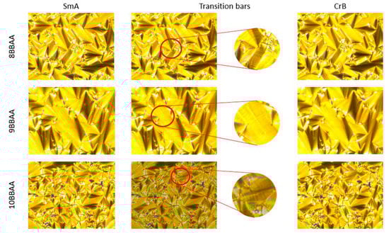 Figure 1. The focal conic fan texture of SmA and CrB phases and transitions bars separating both mesophases for 8BBAA, 9BBAA, and 10BBAA.