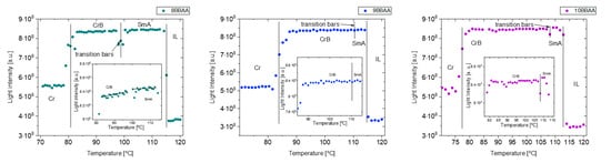 The focal conic fan texture of SmA and CrB phases are presented in Figure 1. Distinguishing differences between textures of those mesophases by the human eyes is difficult. An experienced researcher will notice transition bars (see the middle column in Figure 1), a signature of the SmA–CrB phase transition. The transition bars appear and vanish quickly, which is characteristic of that phenomenon. Usually, the existence of transition bars is noticed in TOA thermograms (see Figure 2) as a collapse of light intensity between SmA and CrB phases. That dependence has been noticed in the case of 8BBAA and 10BBAA, but 9BBAA does not show it. Moreover, it is often noticed that the light intensity recorded for the focal conic texture of SmA has higher values than the light intensity noticed for the focal conic texture of the CrB phase [25]. Only 8BBAA compound follows that behavior. For 10BBAA, some texture of the SmA phase occurs higher light intensity than textures of the CrB phase and others lower. The light intensity of the focal conic fan texture of the SmA phase of 9BBAA does not differ from the focal conic fan texture of the CrB phase of 9BBAA. One can find in literature TOA thermograms where the light intensity in the frame of the same phase changes more rapidly than the light intensity shift observed between SmA and CrB phase transitions for the 8BBAA, 9BBAA, and 10BBAA compounds [26,27,28].