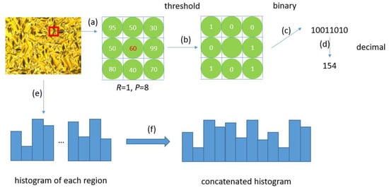 The LBP method is a significant breakthrough in texture analysis. It is widely used for texture analysis and classification in computer vision and image classification. The basic idea behind the LBP algorithm is to encode an image’s local structure or texture information by comparing the intensity values of a central pixel with its neighboring pixels. The scheme of the LBP algorithm is presented in Figure 3. At first, each pixel g c in the image is compared with a chosen number of neighboring pixel points (P) in a chosen distance, a radius R, from that pixel g c (see Figure 3a). The user chooses the R and P values. Next, the values of neighboring pixels g i are binarized (can take two possible values 0 or 1), due to the value of the central pixel g c following with Equation (1) (Figure 3b):