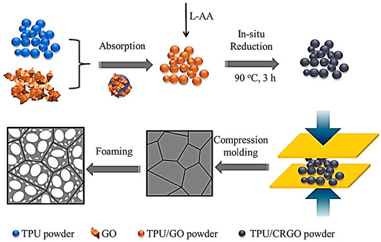 Schematic showing the fabrication process of TPU/RGO nanocomposite foams [57]. L-AA = L-ascorbic acid; TPU = thermoplastic polyurethane; GO = graphene oxide; TPU/GO = thermoplastic polyurethane/graphene oxide; TPU/RGO = thermoplastic polyurethane/reduced graphene oxide; TPU/CRGO = thermoplastic polyurethane/reduced graphene oxide through compression molding. Reproduced with permission from Elsevier.