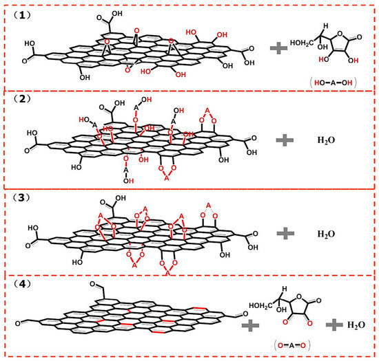 Schematic drawing of in situ reduction of graphene oxide using L-ascorbic acid: (1,2) reaction of L-ascorbic acid and graphene oxide; (3) water addition to modified graphene oxide; (4) reaction of reduced graphene and L-ascorbic acid [57]. Reproduced with permission from Elsevier.
