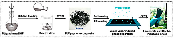 Li et al. [61] reported on polyurethane/graphene nanocomposite foam as an EMI shielding material. Figure 3 shows the procedure for the development of polyurethane/graphene nanocomposite foam. In this process, polyurethane/graphene nanocomposite was obtained via a solution route and precipitated to obtain the product. Then, nanocomposite foam was developed by re-dissolving the precipitate in dimethylformamide and using a solvent-induced phase separation route. As obtained polyurethane/graphene nanocomposite foam had high shielding effectiveness of ~23–24 dB.