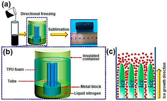(a) Fabrication process of aligned thermoplastic polyurethane/carbon nanotube nanocomposite foam; (b) graphic illustration of the directional-freezing device; and (c) the directional freezing process [76]. Reproduced with permission from ACS.