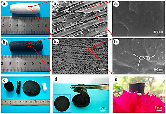 Scanning electron microscopy images of (a1–a3) the unfilled thermoplastic polyurethane foams, (b1–b3) thermoplastic polyurethane/carbon nanotube nanocomposite foams, and (c–e) various shapes of aligned conducting thermoplastic polyurethane/carbon nanotube nanocomposite foams prepared [76]. CNTs = carbon nanotubes. Reproduced with permission from ACS.