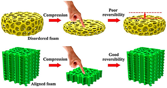 Schematic diagram of the comparison of reversibility process of the aligned and disordered conductive thermoplastic polyurethane/carbon nanotube nanocomposite foams [76]. Reproduced with permission from ACS.