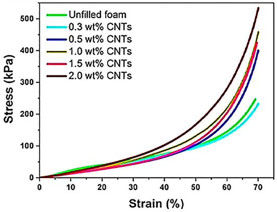 Compression stress–strain properties of the polyurethane/carbon nanotube nanocomposite foams having varying carbon nanotube contents [84]. Reproduced with permission from Elsevier.