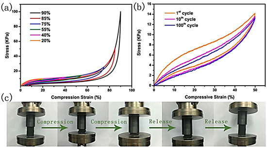 The compression recovery process of polyurethane/graphene foam: (a) stress–strain curves of foams with different set strains of 20 to 90%; (b) cyclic stress–strain curves of foams at 50% strain; (c) compressing and releasing process showing recovery of original shape after compression by more than 90% [109]. Reproduced with permission from Elsevier.
