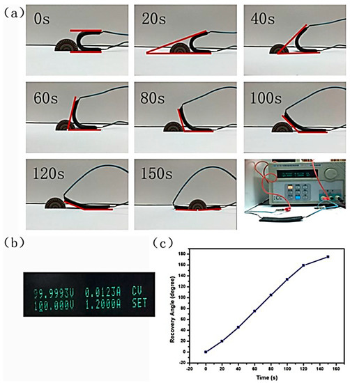(a) Shape recovery process of three-dimensional polyurethane nanocomposite foam with graphene (8 wt.%) and carbon nanotube (3 wt.%) under 100 V; (b) magnification of the screen reading; and (c) the relationship of recovery time vs. recovery angle [109]. Reproduced with permission from Elsevier.