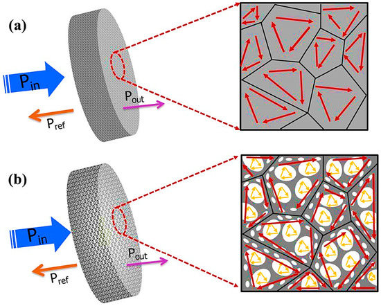 Representation of electromagnetic waves transfer across (a) the thermoplastic polyurethane/reduced graphene oxide nanocomposite and (b) the thermoplastic polyurethane/reduced graphene oxide nanocomposite foam [57]. Red arrows = Reflected radiations; yellow arrows = multiple internal reflections. Reproduced with permission from Elsevier.