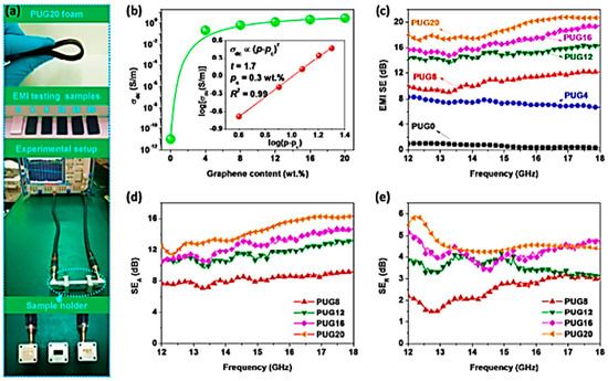 (a) Digital images of polyurethane/graphene foam, electromagnetic samples with varying graphene contents, experimental setup, and the sample holder used; (b) DC conductivity (σdc) of polyurethane/graphene foam foams, where the inset shows the log-log plot of σdc versus (p-pc), and the solid line shows a fit to the measured data using relationship of σdc ∝ (p-pc)t; and (c–e) shielding effectiveness (SE) total, SE absorption (SEA), and SE reflection (SER) of the polyurethane/graphene foams in region of Ku-band [61]. PUG = polyurethane/graphene foam. Reproduced with permission from Elsevier.