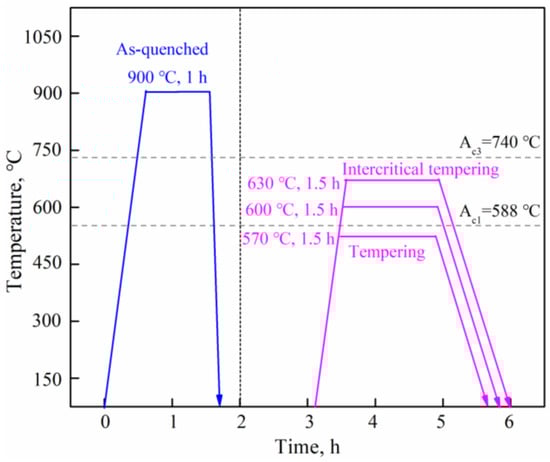 The chemical composition of the high-strength steel was 0.1C-0.2Si-8.5Ni+1.5Mn-0.8(Cr+Mo)-0.06V (wt.%), balance Fe. To manufacture the steel, a 200 kg ingot was melted in a vacuum induction furnace and then cast into a 120 mm thick slab. The slab was heated to 1050 °C for 2 h and then hot-rolled to a 15 mm thick plate through seven passes of rolling between 1000 and 980 °C. After that, the plate was cooled with air to room temperature. The Ac1 and Ac3 temperatures of the tested steel were determined to be 588 and 740 °C, respectively, using a thermal dilatometer (Formastor-FII). The plates were then reheated to an austenitizing temperature of 900 °C for 1 h and water-cooled to room temperature. Finally, the water-cooled plates were reheated to tempering temperatures of 570, 600, and 630 °C for 1.5 h and air-cooled to room temperature. The heat treatment was based on phase transformation temperature, as shown in Figure 1. The plates were named QT570, QIT600, and QIT630, respectively.