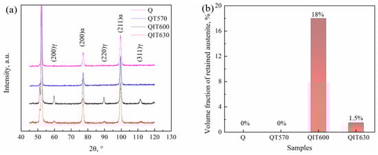 XRD spectra: (a) retained austenite volume fraction; (b) different heat treatments.
