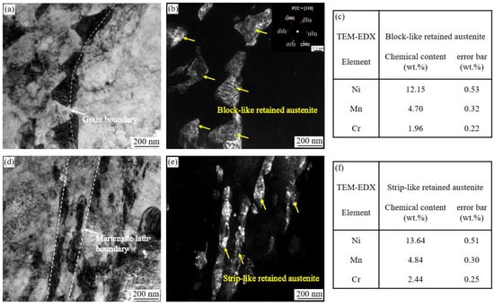 TEM micrographs and corresponding chemical content statistics from EDX in the QIT600 steel: (a–c) block-like retained austenite; (d–f) strip-like retained austenite.