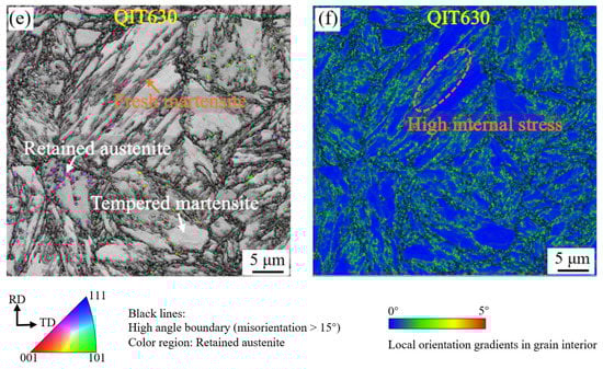 EBSD crystallographic analyses of the (a,b) QT570, (c,d) QIT600, and (e,f) QIT630 steels; (a,c,e) EBSD image quality—IPF of retained austenite; (b,d,f) KAM of matrix—retained austenite/fresh martensite phase mappings.
