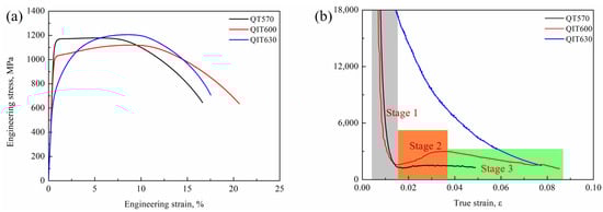 Tensile properties: (a) engineering stress–strain curves; (b) work-hardening rate–true strain curves.