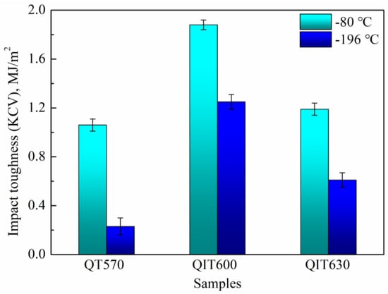 Figure 8 displays the impact energies of the tested steels at temperatures of −80 and −196 °C. Specifically, the QIT600 steel exhibited impact energy of 1.88 MJ/m2 at a temperature of −80 °C, while the QT570 and QIT630 steels demonstrated impact energies of 1.06 and 1.19 MJ/m2, respectively. At −196 °C, the impact energy of QIT600 steel remained consistently high at 1.25 MJ/m2. In contrast, the impact energies of QT570 and QIT630 sharply decreased to 0.23 and 0.61 MJ/m2, respectively. Therefore, the QIT600 exhibited superior low-temperature impact toughness compared to the other tested steels due to its higher volume fraction of retained austenite.