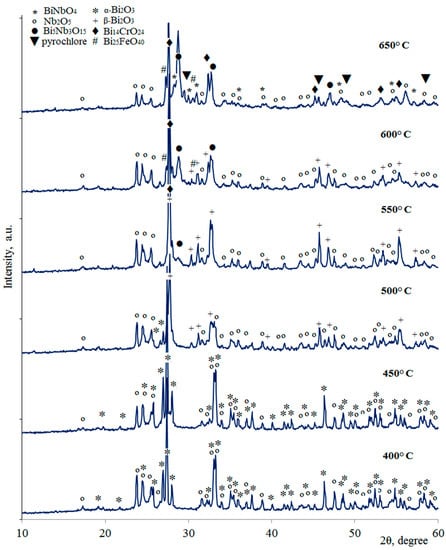 The process of Bi2Cr1/6Mn1/6Fe1/6Co1/6Ni1/6Cu1/6Nb2O9+Δ phase formation was studied by comparing the phase composition of samples calcined every 50 °C in the temperature range of 400–1050 °C. Analysis of phase composition and microstructure and elemental mapping of samples were performed at each stage of heat treatment. X-ray powder diffraction patterns of calcined samples in the temperature intervals of 400–650 °C and 650–1050 °C are shown in Figure 2 and Figure 3.