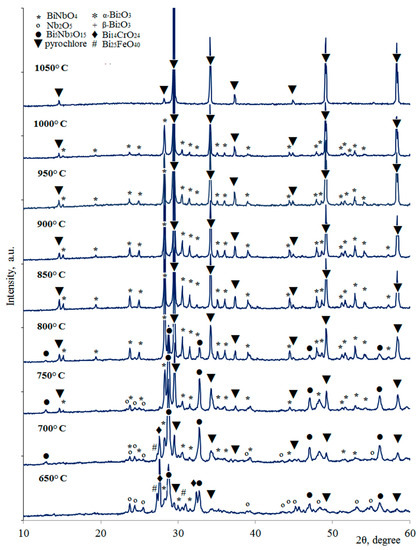 At 550 °C, in addition to the Bragg reflections of β-Bi2O3 and η-Nb2O5 oxides, the Bragg reflections of the interaction products of the initial precursors—Bi5Nb3O15 (sp. gr. P4/mmm, PDF Card-00-055-0528) [38] and chromium(VI) compound Bi14CrO24 (sp. gr. I4/m, PDF Card-01-070-4457) [39] are detected. The formation of intermediate chromium(VI) compounds was observed when pyrochlores of Bi2Mg(Zn)1−xCrxTa2O9.5−Δ up to 700 °C were obtained [30].
