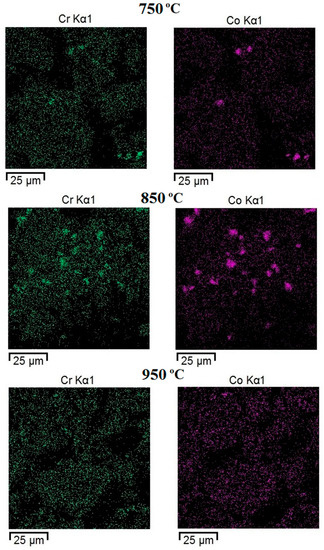 EDX elemental mapping (Co and Cr) of the Bi2Cr1/6Mn1/6Fe1/6Co1/6Ni1/6Cu1/6Nb2O9+Δ, samples, synthesized at temperatures from 750, 850 and 950 °C.